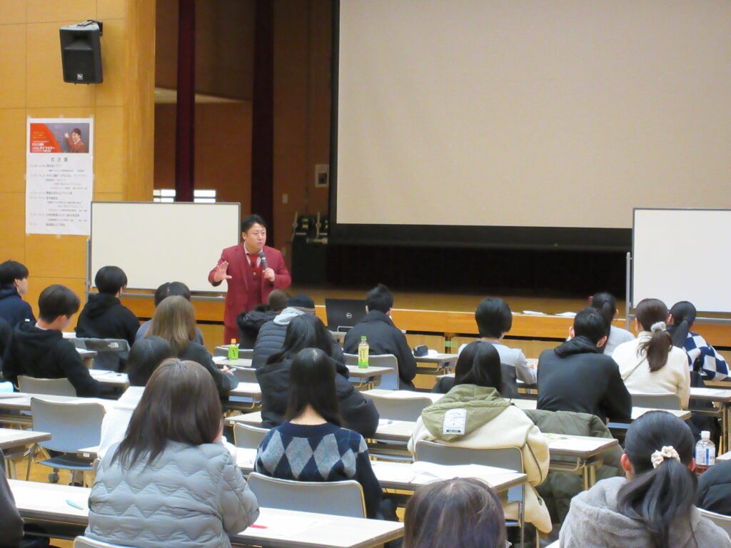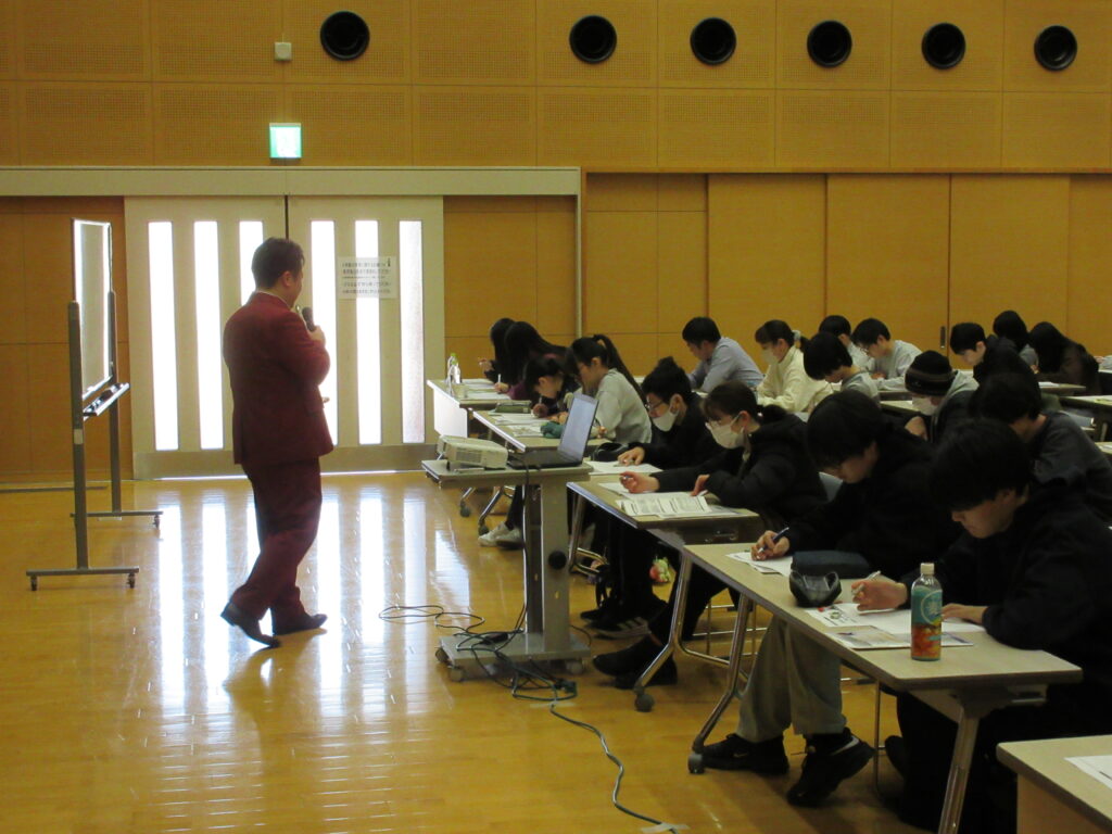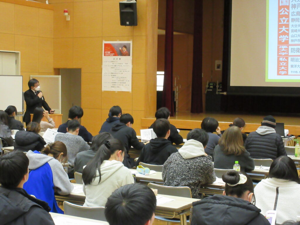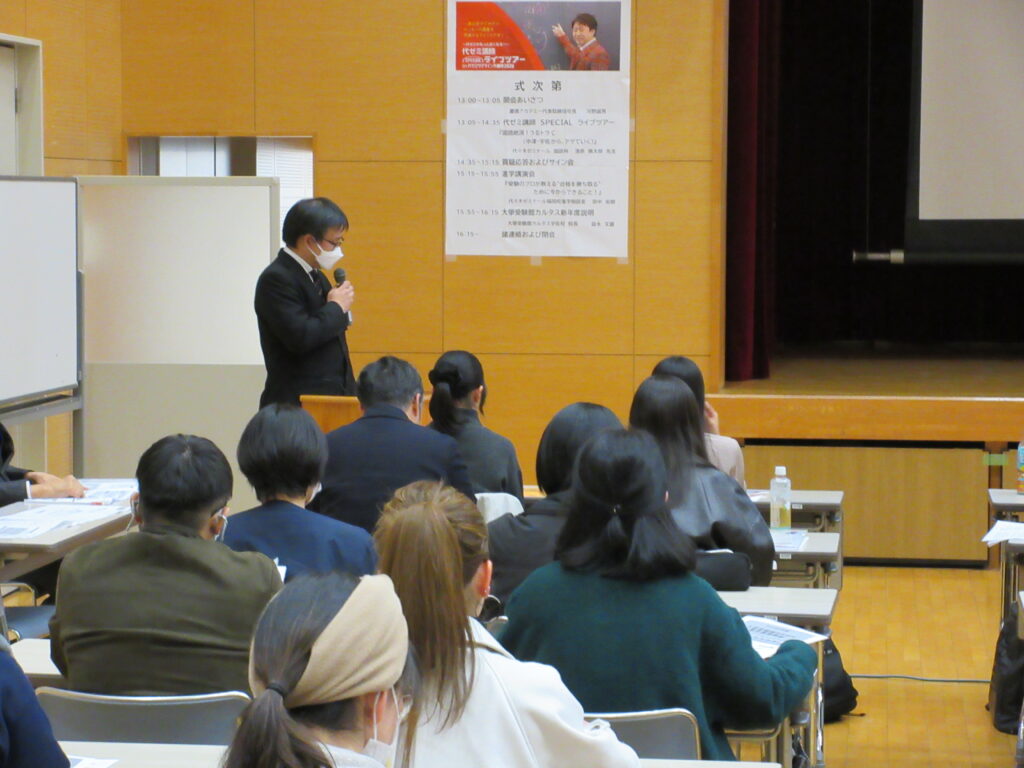 漆原先生の講義のあとは、代ゼミ福岡校進学相談室の田中佑樹さんに、大学入試全般についての進学講演を行っていただきました。