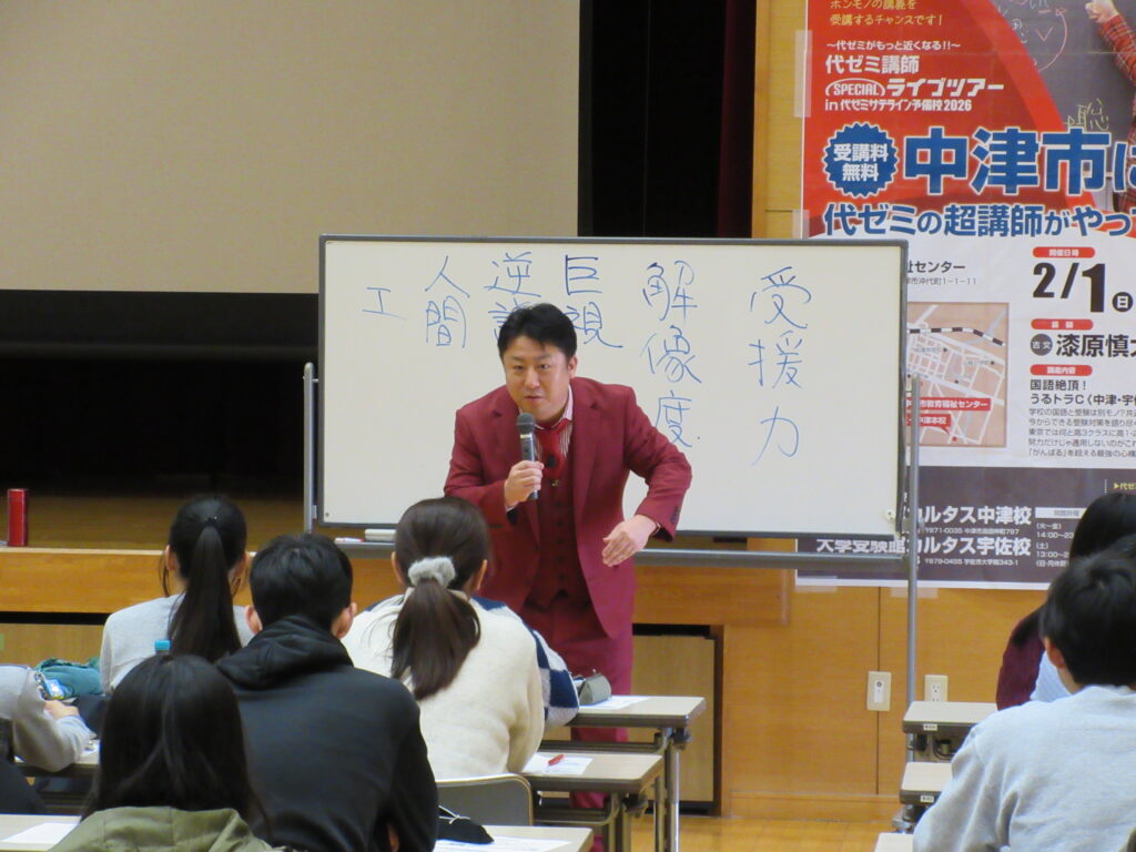 今年は代ゼミ国語科の漆原慎太郎(うるしばら しんたろう)先生に中津にお出でいただき、「国語絶頂!うるトラC <中津・宇佐から、アゲていく>」と題して、非常に刺激的でかつ示唆に富む講義をしていただきました!