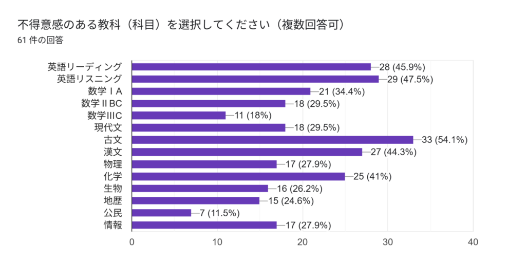 近年の大学入試は、国語に限らず、理系教科であっても確かな「論理的読解力」が求められます。一方で、生徒の多くが国語という教科に対して苦手意識を持っていることが、このアンケートからも明確に読み取れます。活字離れが叫ばれて久しいですが、論理的に物事を考える力というのは一朝一夕には身につきません。小手先のテクニックでは劇的な改善は見込めませんので、早期から自学自習していくことが大切です。まずは語彙を増やしましょう。そして、易しめの文章から始めても構いませんので、文章を考えながら読む習慣をつけましょう。また、古文・漢文が現代文よりもさらに不得意感のある科目として回答されていました。これは様々な原因が考えられますが、英語に苦手意識を持つ生徒の大多数に共通する、単語や文法という基礎を徹底することへの忌避感が根底にあるのではないかと思います。高校の英語・古文・漢文の授業で、先生が披露する構造分析や解釈をなんとなく覚える、あるいは、ネットにも出回る本文の現代語訳をながめて覚える、のような、お膳立てされたものをなんとなく覚える定期テスト直前つめこみ式の、その場しのぎの勉強しかしていない人は、英語や国語の成績が伸びることはありません。英単語・英文法、古文単語・古典文法、漢文句形を覚えることから始め、大切なのは、それらの基礎を使って、初見の文を自力で分析&解釈できるようにしていく学習をすること。そして、できなかったときはその原因を特定し、改善につなげていくこと。